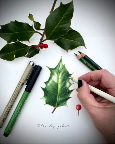 Join Botanical Artist and illustrator Sophie Smith for a relaxed workshop indoors illustrating winter foliage by layering brush pens with coloured pencil.