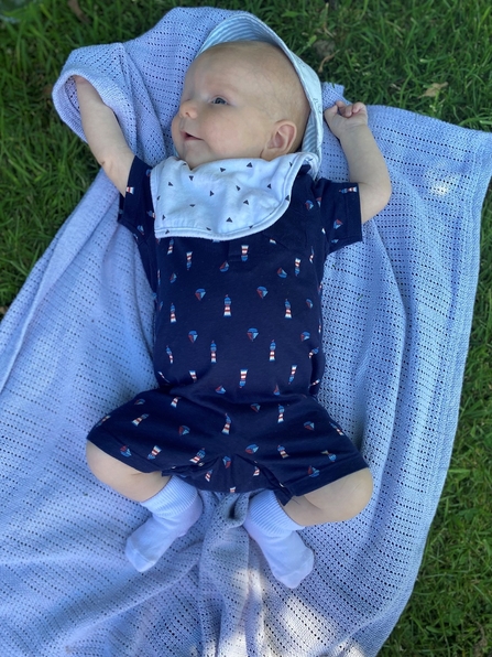 Arthur playing on his play mat in the shade on the grass. He was watching the sky lots and listening to the birds singing!