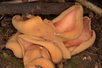 Red elf cup fungus growing among moss and dead leaves, the Wildlife Trusts