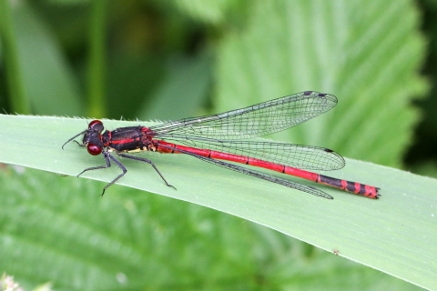 The Large red damselfly is a medium-sized damselfly that lives around the edges of ponds, lakes, ditches and canals, and can also be found away from breeding sites in grassland and woodland. The earliest damselfly to emerge in the UK, it is on the wing from the end of April through to August. It is a regular visitor to gardens.