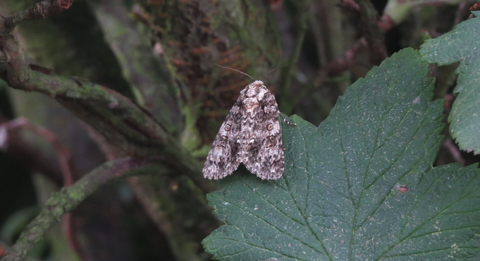 The moths are mottled grey, with a grainy texture. They're quite variable and can look very similar to several other species. They usually have a small, curved white mark on the rear edge of the forewing (the side closest to the body when at rest), which helps identify them.