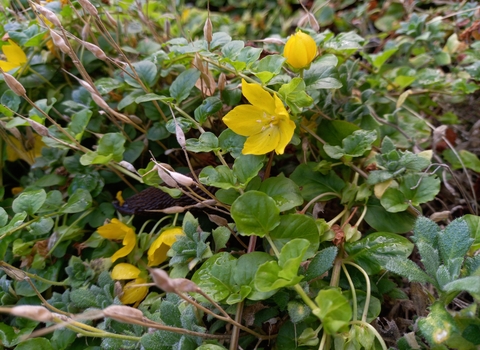 Creeping jenny is a low-growing plant of wet grasslands, riverbanks, ponds and wet woods. It has cup-like, yellow flowers and is a popular choice for garden ponds.